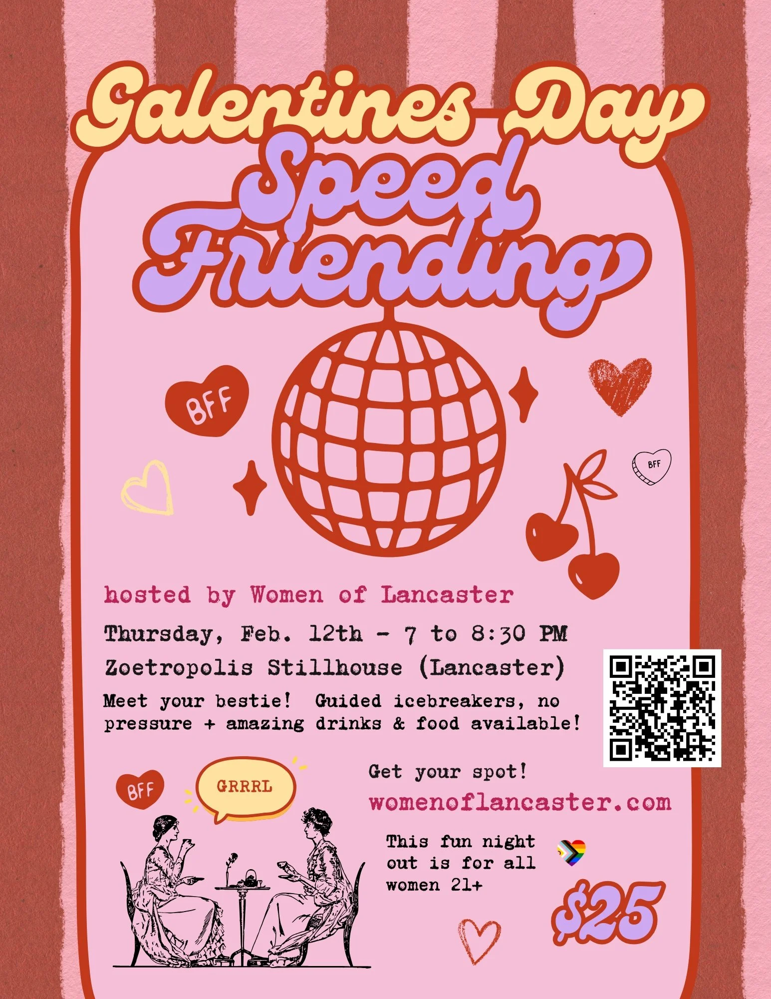 Whether you’re celebrating Galentine’s, need a girls’ night out, or just craving more friendship, Women of Lancaster is hosting a Galentine’s Day Speed Friending Night at Zoetropolis — and it’s going to be so FUN.